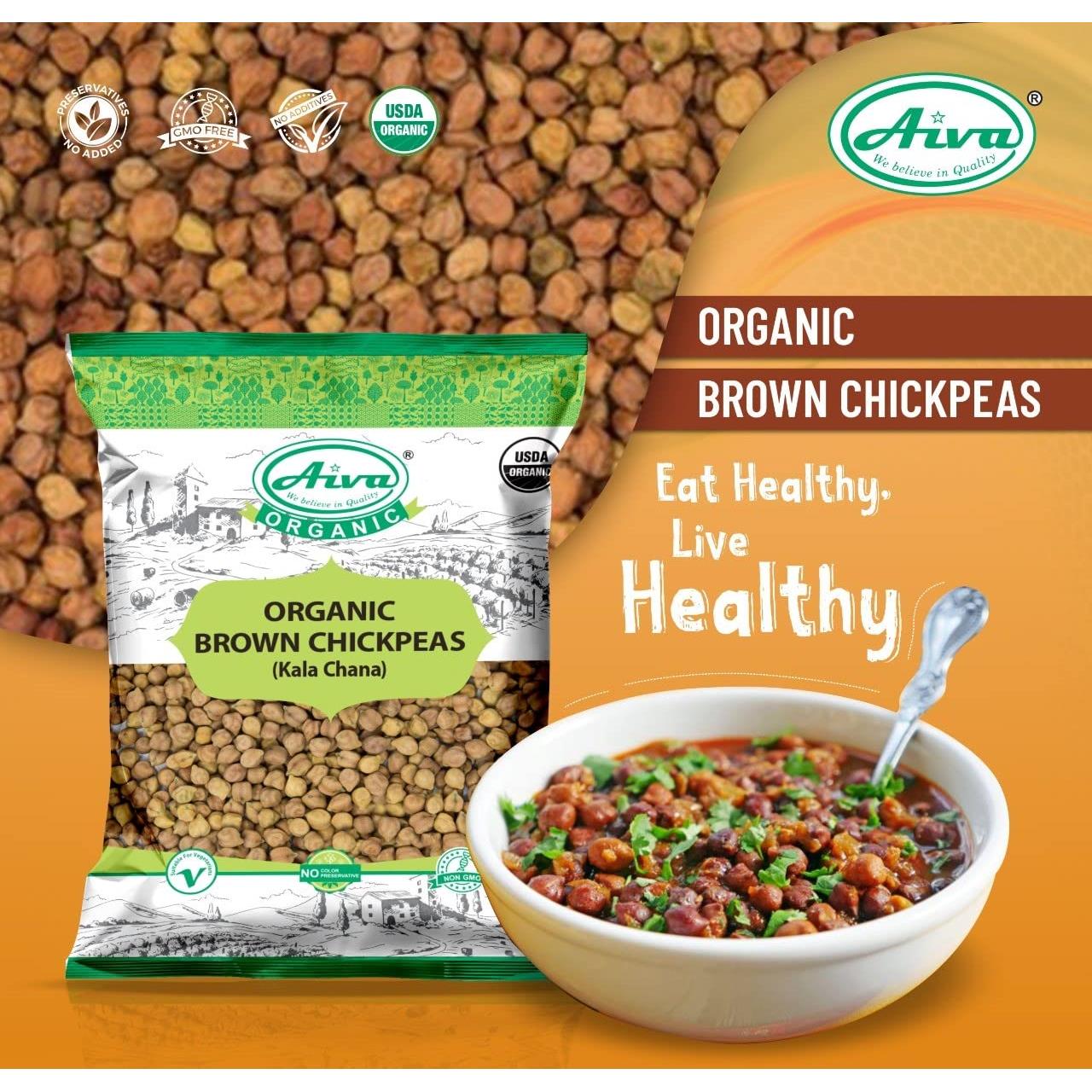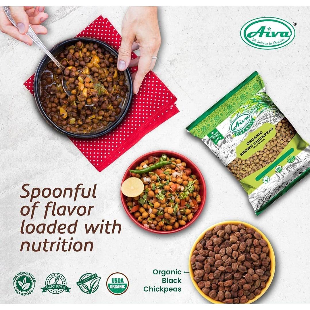Organic Brown Chickpeas or Kala Chana is a small dark brown colored chickpea with a rough coat. It is cultivated mostly in Indian and other parts of the Indian sub-continent, as well as Ethiopia, Mexico, and Iran. Organic Aiva Kala Chana is sourced from India. It is high in fiber and protein and has a low glycemic index. As a result, it helps control weight. Aiva Products is committed to working with organic & sustainable farming groups that grow only organic, have traceability records, and, are USDA Organic certified This product is Organic, No GMOs, Non-ETO and Aiva Products is a brand "Where You Can Trust"