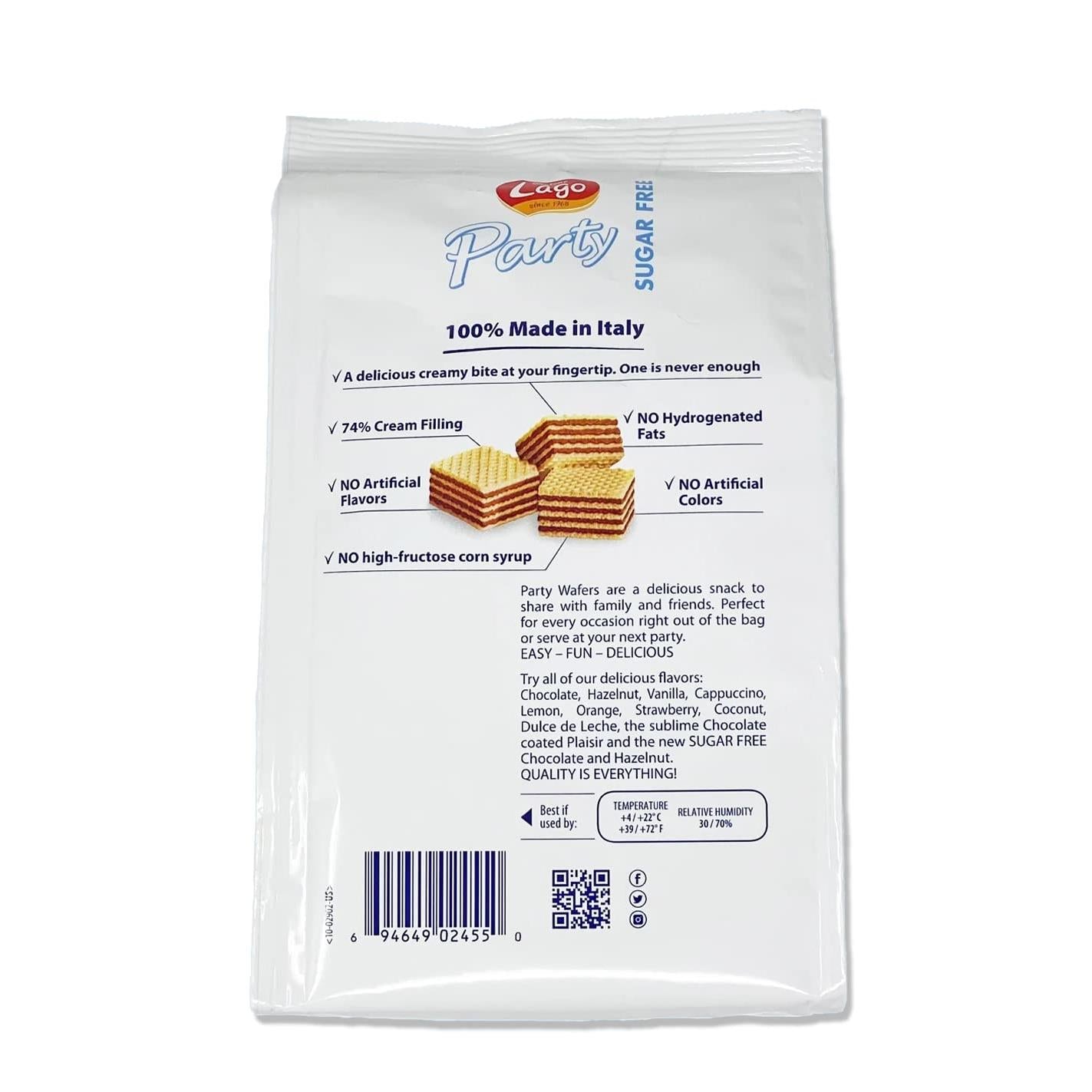 Lago Party chocolate cream wafers are sugar-free snacks that are perfect for those looking to reduce their daily sugar intake while not giving up on favorite munchables. Smooth layers of chocolate cream are sandwiched between crunchy wafers to create an ideally balanced treat with no sugar. Named after the word “waba” (origins uncertain), meaning beehive, wafers are a classic crispy treat with different variations in many countries all across the globe. With predecessors like Belgian & German waffles, it’s hard to pinpoint where exactly the idea of Neapolitan wafers was born, but the first official recipe belongs to the Viennese Joseph Manner, and it dates back to 1898. Since then, these cream-filled sandwich biscuits have become one of the universally beloved treats, and thanks to brands like Loacker & Lago, they’ve also established themselves as one of the Italian favorites. You can find plenty of flavors of these stunning delights in our selection of Italian wafers. Lago is one of the most beloved confectionery brands born in Italy. With over 50 years of experience, the brand combines its advanced technical expertise with great dedication, innovation, and focus on quality to provide a wide range of authentic products made with no artificial colors or flavors and no hydrogenated fats. Lago wafers as well as other great brands’ products can be found in our online Italian grocery store. Chocolate cream Party wafers with no sugar are one of the best ways to add a touch of extra sweetness and texture to your desserts without adding too much sugar. Enjoy these classic chocolate cream wafers along with a cup of espresso for the ultimate Italian breakfast! Ingredients: Maltitol, wheat flour, coconut oil, low-fat cocoa, soy lecithin, salt, sodium bicarbonate, vanilla extract. Contains wheat, soy. May contain peanuts, hazelnuts, egg, and milk. Product Weight: 7.5 oz (213 g) Product of Italy