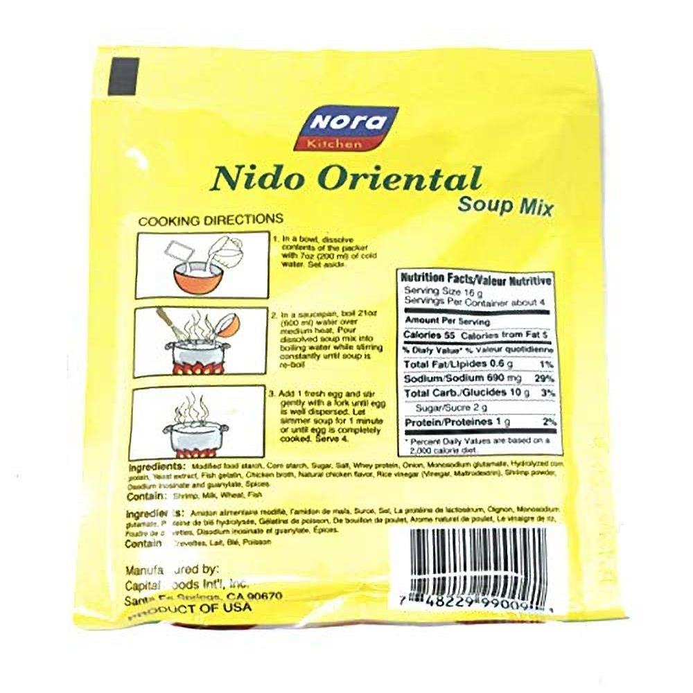 Nora Chinese Style Nido Oriental Soup Mix - Add one egg (Melange De Soupe Nido) in in 2.12oz (60g) sachet. Serve-4. Cook in 5 Minutes. Product of United States.